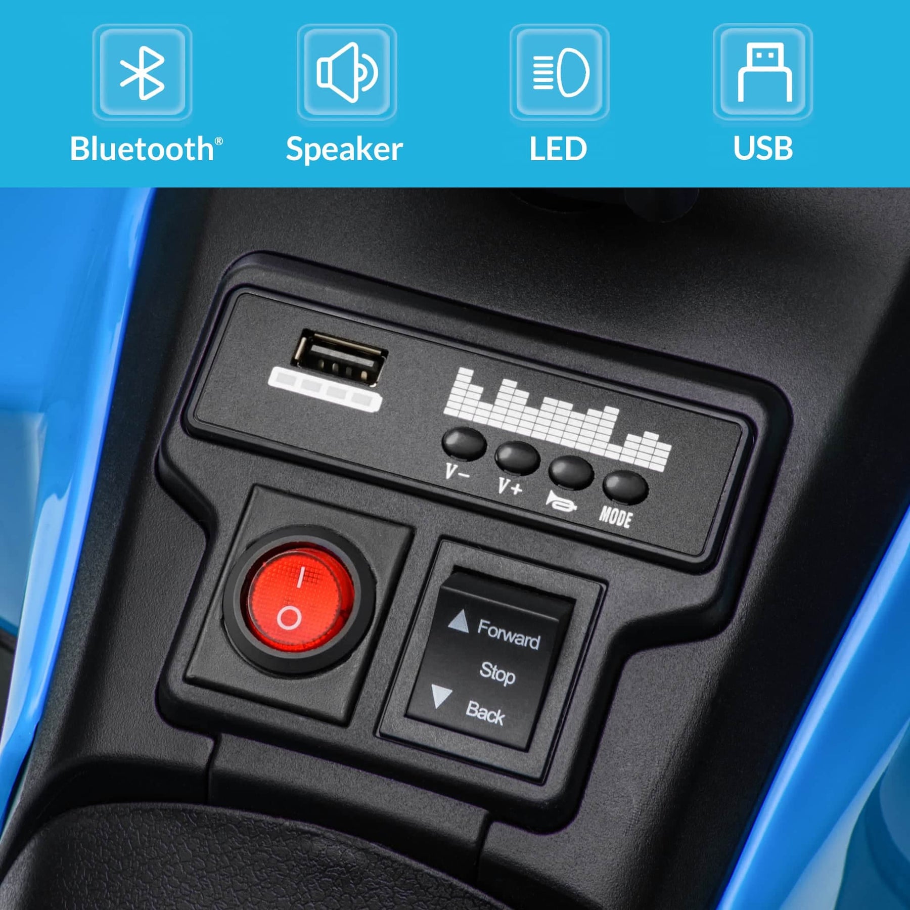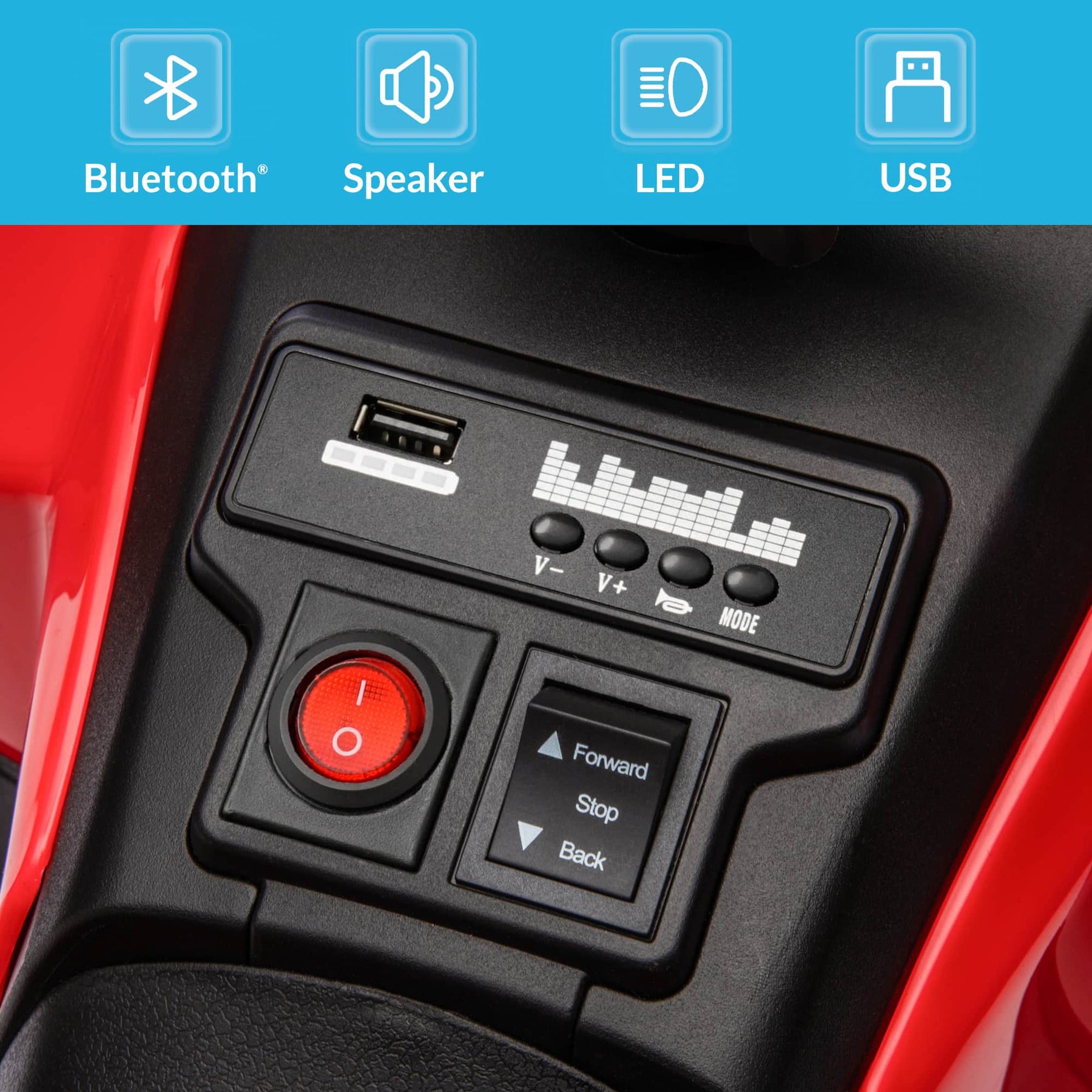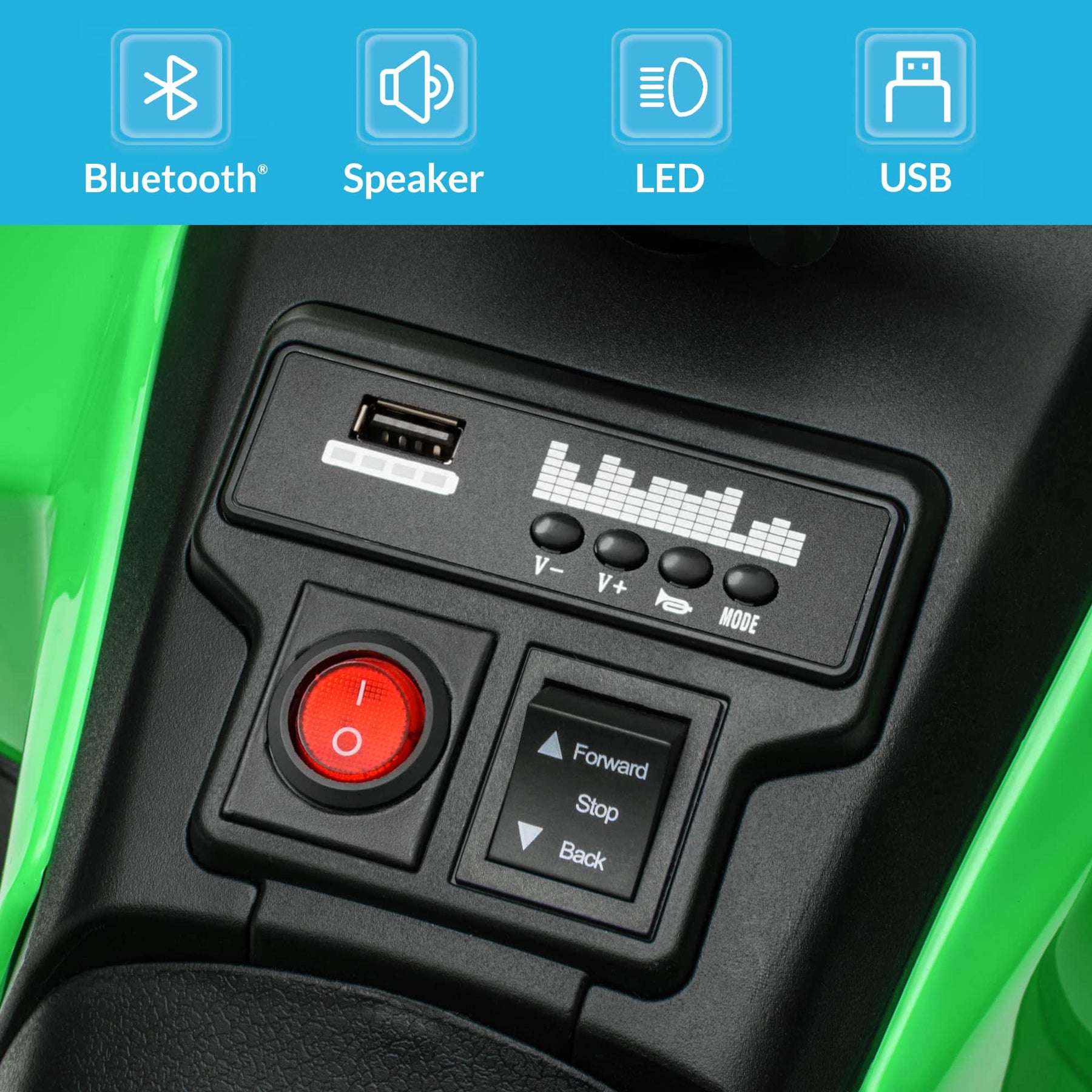 • Bluetooth & USB Audio Play - Equipped with Bluetooth and USB ports, this ATV lets kids enjoy music directly from your phone or devices. Comes with a fun horn sound for an even more entertaining ride.