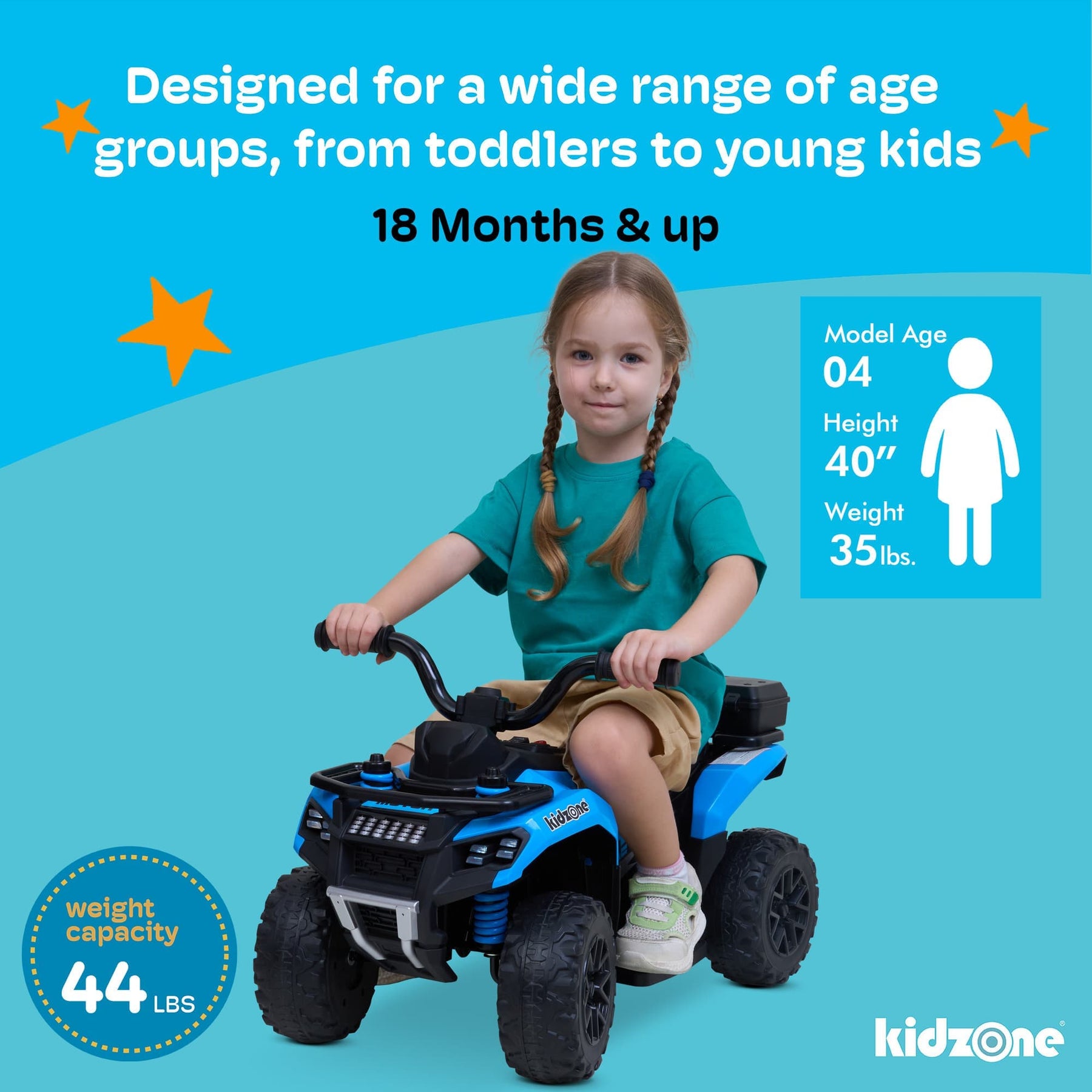 The ride-on is designed for toddlers 18 months and older. It has a comfortable single seat and supports up to 44 lbs
